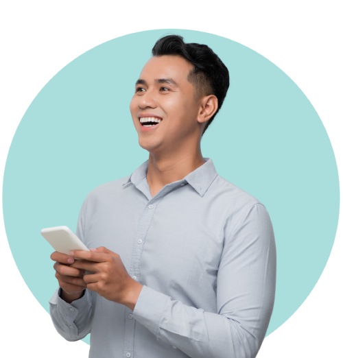 Man Smiling while holding computer blue circle background